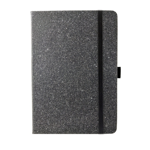 Eco-friendly A5 notebook with recycled leather cover with matching colour elastic closure, pen loop, ribbon marker and rear envelope pocket. 96 sheets of recycled 80gsm paper inside available in natural or black. Also available with soft cover.
